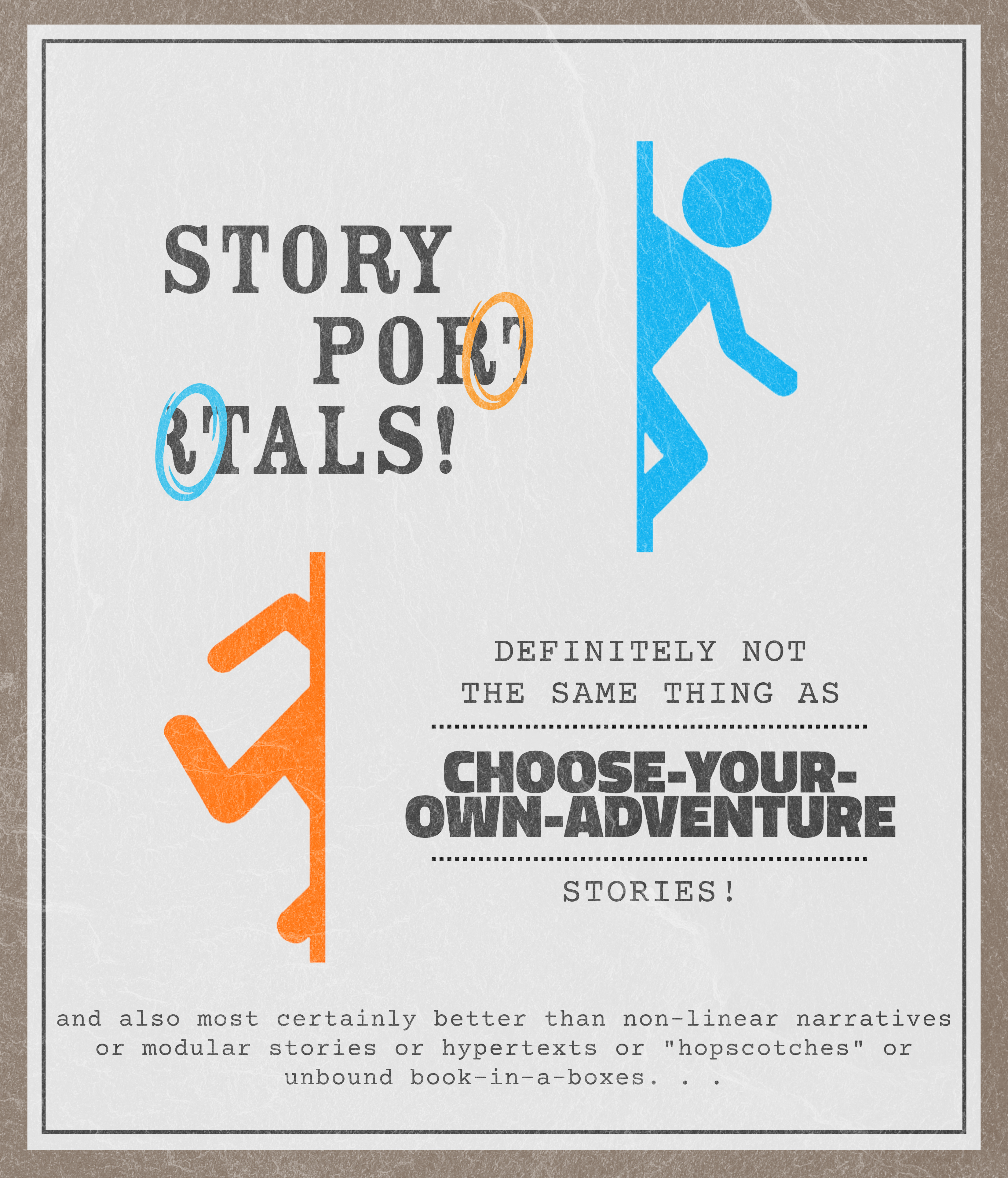 I realize that this idea is still far from being perfect. It somehow feels like a glorified (or lazier) version of choose-your-own-adventure stories, except there is no need for a connection between the point A and B, and the only thing the reader chooses is whether to step into the portal or not.